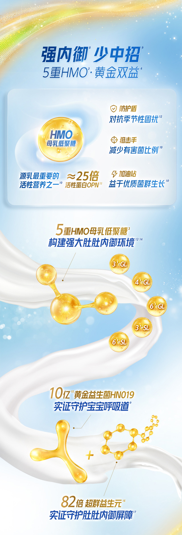 [2] 美素佳儿源悦幼儿配方奶粉/儿童配方奶粉中的5重HMO及添加的益生菌-动物双歧杆菌乳亚种HN019和益生元-低聚半乳糖。Xiao-ming B, et al. Chinese medical journal 117.6(2004):927-31.; Sierra C, et al. Eur J Nutr (2015) 54:89–99; Sazawal S, et al. (2010). PLoS ONE 5(8): e12164; S.S. van Leeuwen, et al. Carbohydrate Research 400 (2014) 59–73; Logtenberg Madelon J, et al. J. Agric. Food Chem.2020 68 (29), 7800-7808; Li W, et al. Journal of Functional Foods,2015,13158-168.; Meeusen E, et al. Organic & biomolecular chemistry,2024