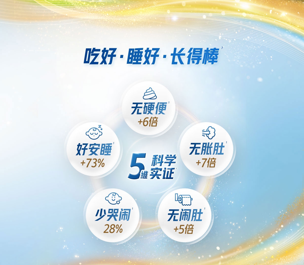 [1] 5维实证是指接受蛋白质糖基化(闭锁赖氨酸)水平较低的配方奶粉喂养的宝宝,父母报告其:无硬便样本数较无硬便样本数最低组高6倍;夜哭时长较夜哭时长最长组少28%;正常睡眠比例较正常睡眠比例最低组高73%;无胀气样本数较无胀气样本数较低组高7倍+;无腹泻样本数较无腹泻样本数最低组高5倍+。Yang X S., et al. Journal of nutrition and metabolism 2020.(2020):1807397.