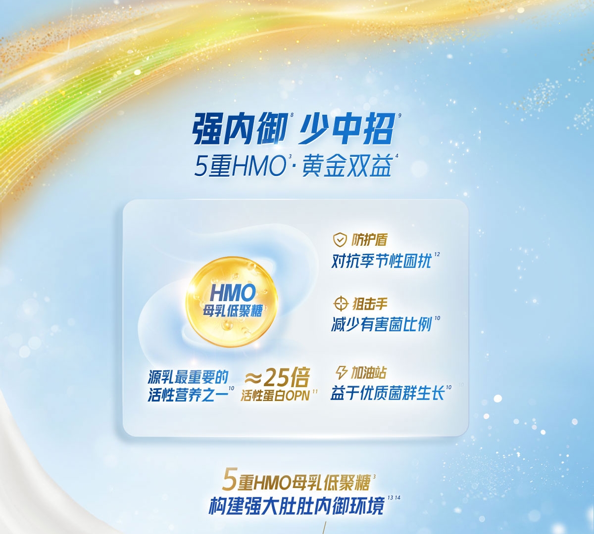 [2] 美素佳儿源悦幼儿配方奶粉/儿童配方奶粉中的5重HMO及添加的益生菌-动物双歧杆菌乳亚种HN019和益生元-低聚半乳糖。Xiao-ming B, et al. Chinese medical journal 117.6(2004):927-31.; Sierra C, et al. Eur J Nutr (2015) 54:89–99; Sazawal S, et al. (2010). PLoS ONE 5(8): e12164; S.S. van Leeuwen, et al. Carbohydrate Research 400 (2014) 59–73; Logtenberg Madelon J, et al. J. Agric. Food Chem.2020 68 (29), 7800-7808; Li W, et al. Journal of Functional Foods,2015,13158-168.; Meeusen E, et al. Organic & biomolecular chemistry,2024